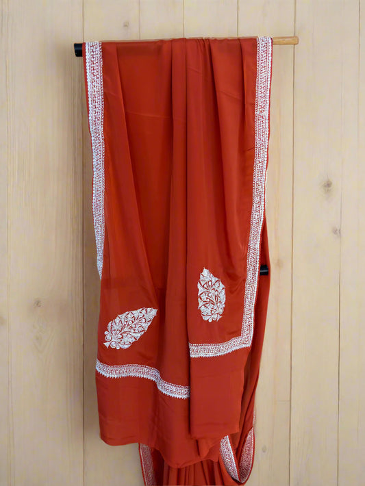 Pamposh Rust Orange Crepe Saree with Kashmiri Tilla Embroidery
