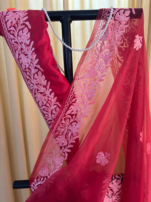 Noor Red Organza Saree With Kashmiri Aari Embroidery