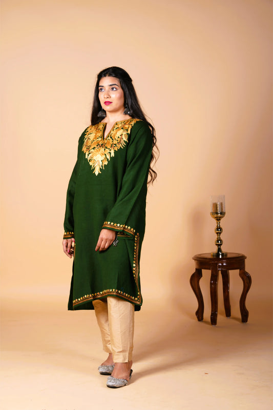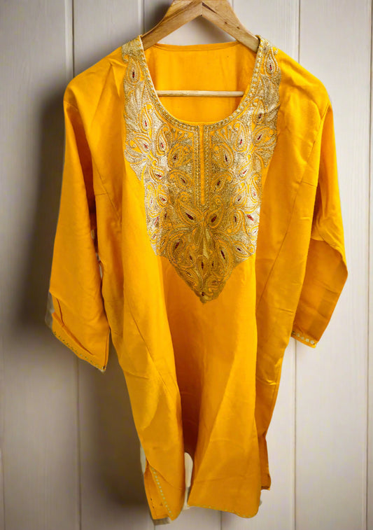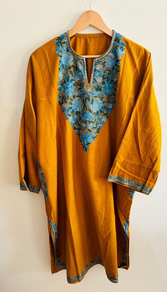 Chinar Mustard with Blue Embroidery Aari Work Pheran
