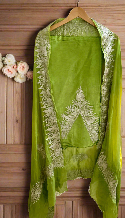Sufianna Green Unstiched Silk Suit with Tilla Embroidery