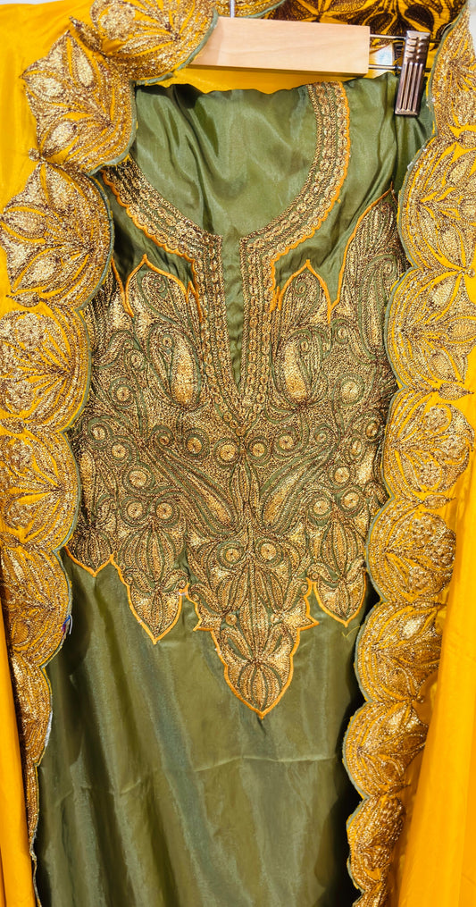 Nayna Olive Green Unstitched Suit with Mustard Dupatta | Tilla Embroidery