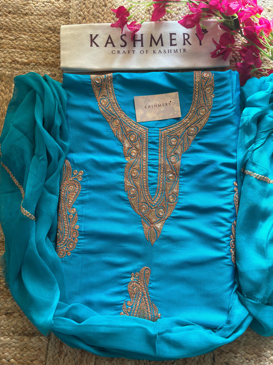 Ferozi Blue Unstiched Suit with Tilla Embroidery