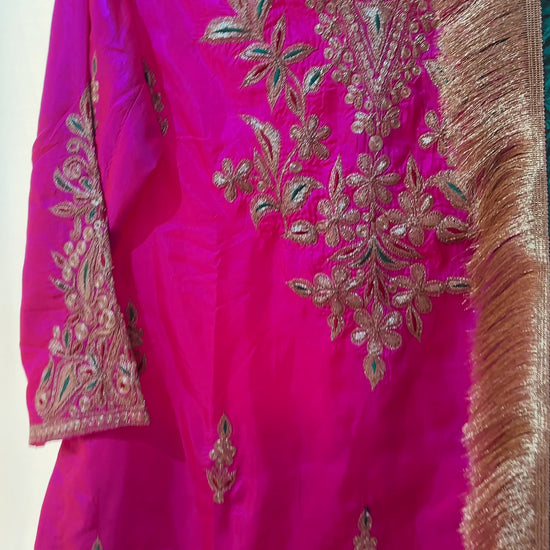 Rani Pink Silk Suit Set with Tilla Embroidery & Green Dupatta | Kashmiri Ethnic Wear