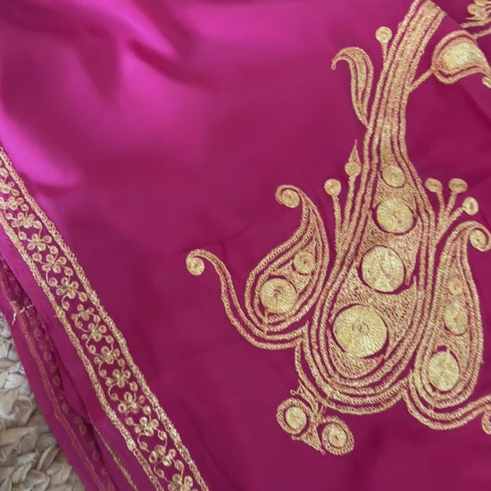 Collection Details: The Omang collection, is crafted to bring a unique charm to brides, bridesmaids, or for parties. The beautiful Kashmiri Tilla embroidery adds an elegant, traditional touch to this luxurious saree, making it a perfect choice for any special occasion.